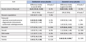 Le conclusioni di queste metanalisi sono state messe in discussione da una successiva RS indipendente [17]. Gli autori non identificano RCT pubblicati, mentre individuano 107 studi dai registri delle agenzie di sorveglianza nazionali e internazionali (US Food and Drug Administration, European Medicines Agency e Japanese Regulator) e delle case farmaceutiche GlaxoSmithKlinee Roche: 46 di questi vengono inclusi (20 su oseltamivir, n=9.623; 26 su zanamivir, n=14.628). Tutti gli studi sono giudicati ad alto rischio di bias (attrition bias e selective reporting bias); per quanto riguarda oseltamivir in particolare, in 10 studi non è descritto il processo di randomizzazione e in 11 studi le capsule di placebo mostravano aspetto differente da quelle del farmaco (mancanza di cecità). Tra i 26 studi su zanamivir, solo uno descrive il processo di randomizzazione e solamente un altro descrive le apparenze del farmaco e del placebo. I risultati più significativi sono riportati in tabella 3.