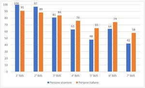 Dopo il lieve calo rilevato nel 2022, la copertura è tornata a crescere come media regionale ed è pari a 74.5% (era 71.8% nel 2023). La copertura si riduce, come già evidenziato in passato, passando dal primo al settimo BdS ed è sempre maggiore nelle persone assistite italiane, anche se si registrano incrementi più consistenti delle coperture nelle persone assistite straniere.
