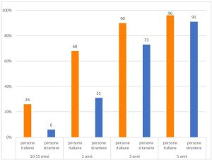 In aumento la frequenza presso i servizi educativi e scuole dell’infanzia rispetto al 2023. In particolare, 22.5% delle persone bambine assistite frequenta il nido a 10-11 mesi, 62.6% a 22-24 mesi, 87.8% frequenta le scuole di infanzia a 33-39 mesi e 95.1% a 5-6 anni. Si conferma il minore accesso ai servizi educativi per l’infanzia delle persone bambine straniere rispetto a quelle italiane, con un divario che si riduce, ma non si colma, solo a 5 anni di vita.