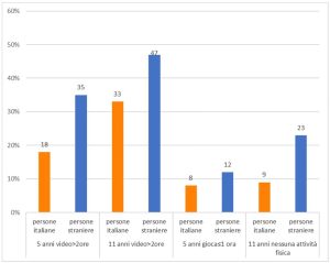 Figura 3. Stili di vita (tempo davanti allo schermo e attività fisica non adatti all’età) distinti per cittadinanza delle persone bambine e adolescenti, 2024.